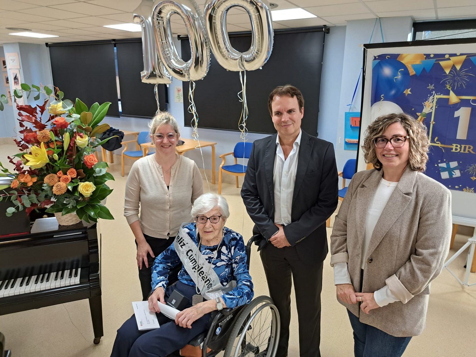La palamosina Montserrat Cardó Prunell ha celebrat el seu aniversari, arribant a l’edat de cent anys. Per aquest motiu, com ja és habitual amb tots els palamosins i palamosines que superen el centenari, l’alcaldessa de Palamós, Maria Puig, i la regidora de Gent Gran, Yolanda Aguilar, van felicitar la senyora Cardó en nom del municipi, lliurant-li un ram de flors.