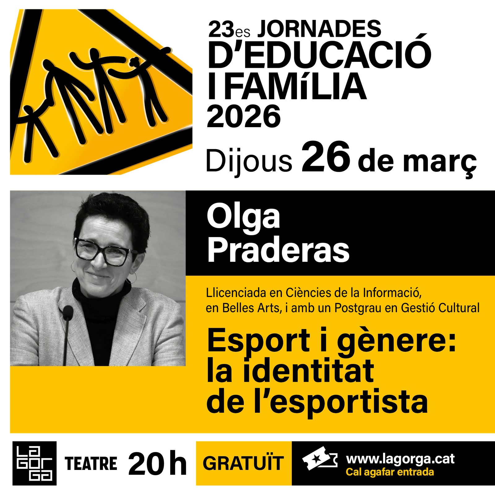 Finalment, les Jornades d’Educació i Família 2026 es tancaran el dia 26 de març, amb la conferència “Esport i gènere: la identitat de l’esportista” a càrrec de la llicenciada en Ciències de la Informació i Belles Arts, ponent i formadora, Olga Praderas.