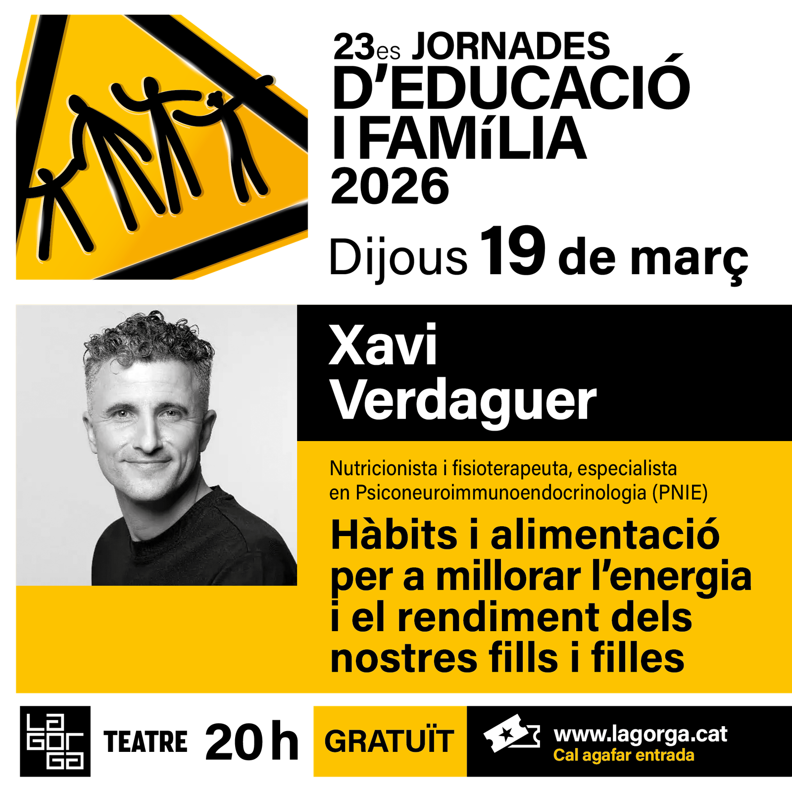 La conferència de Verdaguer rep el títol “d’Hàbits i alimentació per millorar l’energia i el rendiment dels nostres fills i filles”, mitjançant la qual es parlarà de la salut integral, incidint en el descans, la son, l’alimentació, o els hàbits tecnològics dels joves, per tal que el primer i el segon cervell (intestins), treballin per donar l’energia necessària per a millorar el rendiment i la salut integral, tant dels adults com dels nois i noies. La xerrada farà una especial atenció a poder detectar diverses alteracions, o bé el mal funcionament en els diferents sistemes de l’organisme dels fills i les filles.