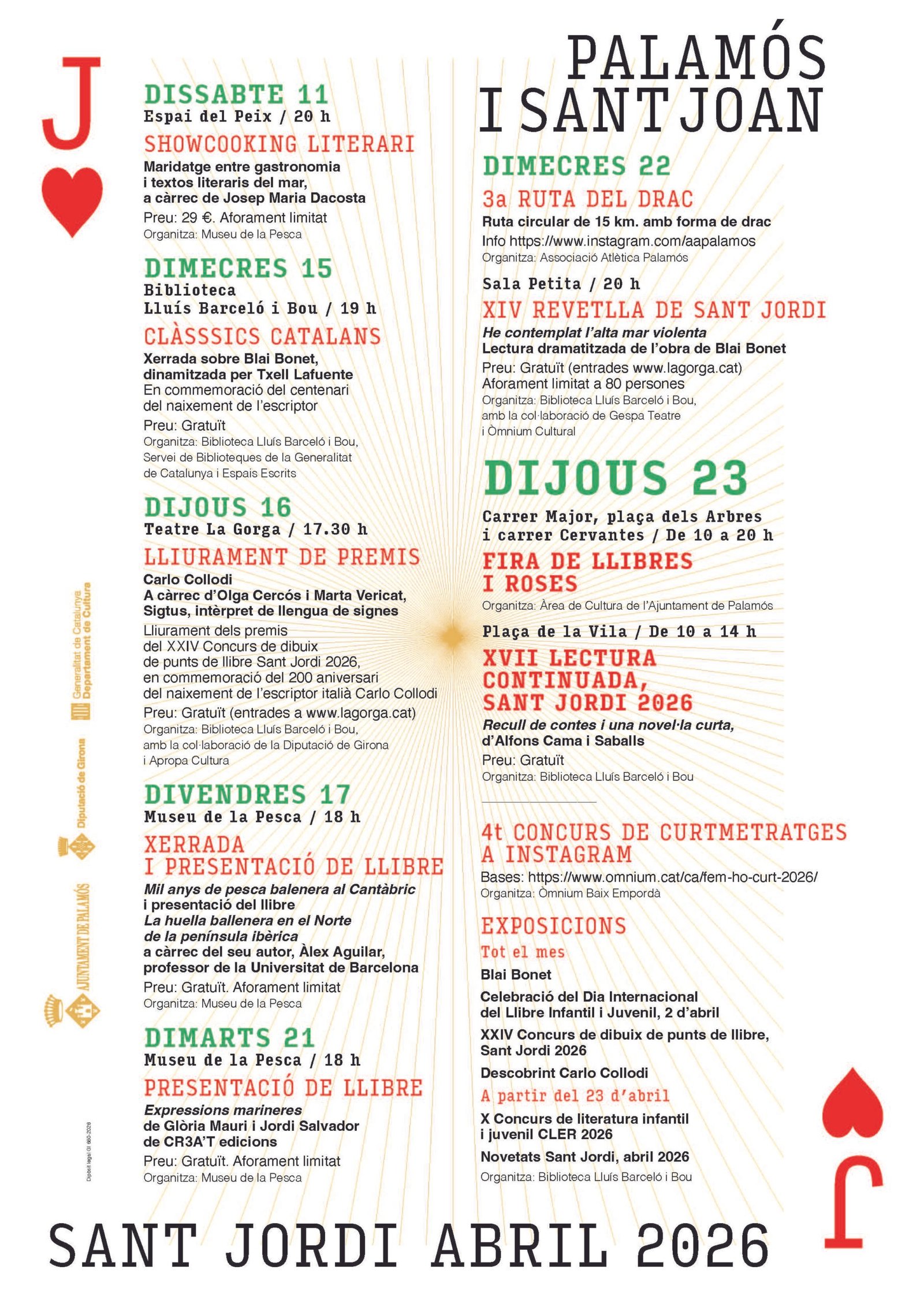 La Diada de Sant Jordi a Palamós tindrà com a acte central la tradicional fira de llibres i roses, que enguany comptarà amb unes quaranta parades participants, de professionals i entitats locals, que s’ubicaran als carrer Major, Cervantes i a la plaça dels Arbres.