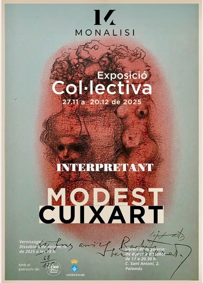 Del 27/11/25 al 20/12/25, en el marc de les celebracions del centenari de Modest Cuixart, Monalisi, en col.laboració amb la Fundació Modest Cuixart de Palafrugell, proposa una exposició de pintura i escultura sobre el tema “Interpretant Modest Cuixart” en què els artistes associats interpretaràn, cadascú amb el seu estil i tècnica, una obra de Modest Cuixart. En aquesta exposició també s’exposaràn a la venda litografies originals, numerades i signades per Modest Cuixart, de la sèrie “Eròtica”.