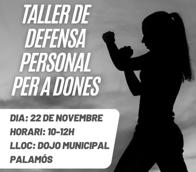 Dojo Municipal de Palamós Carrer Santiago Bañeras y Goday, Palamós, Girona, SpainEsports i SalutAmb motiu dels actes del 25 N, Dia Internacional per a l'erradicació de la violència envers les dones, l'Ajuntament de Palamós, mitjançant l'Àrea d'Igualtat, organitza un taller de defensa personal dirigit a les dones. Gratuït però amb inscripció prèvia a: 630635083