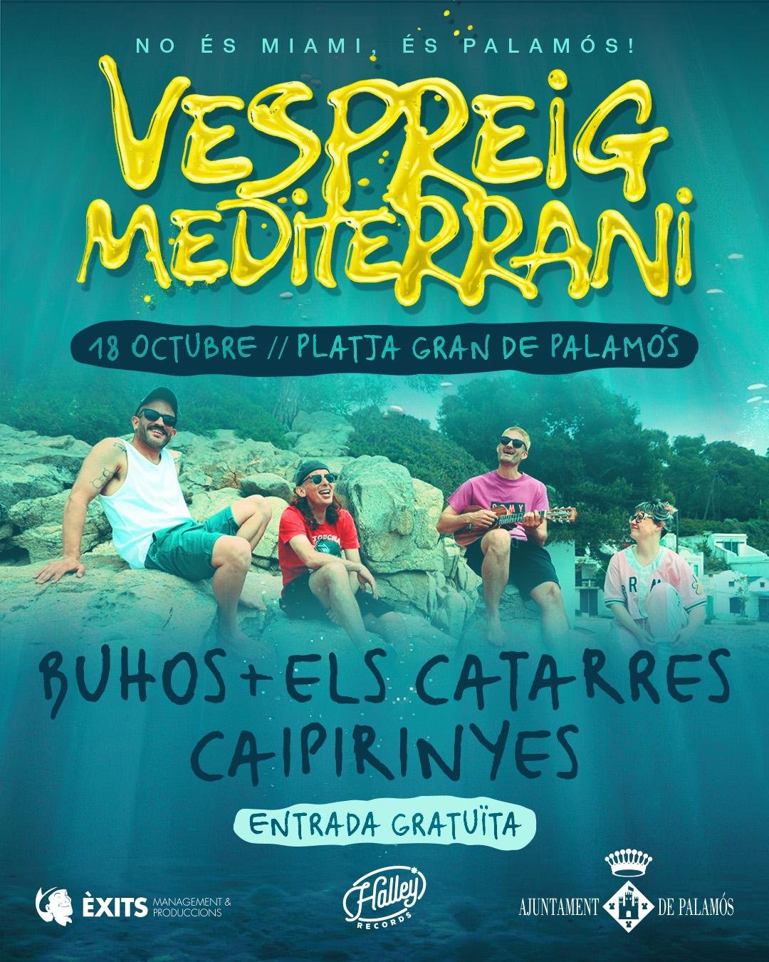 Espectacles i OciEls reconeguts grups de música catalans Buhos i Catarres organitzen un Vespreig Mediterrani amb música i bon rotllo el proper dissabte 18 d'octubre a la platja Gran de Palamós. 18 h Les Caipirinyes 19.30 h Els Catarres21.30 h Buhos23.30 h La Nit del Canet
