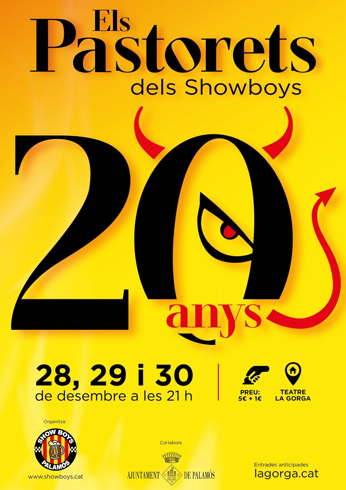 Teatre La Gorga Carrer Notaries, Palamós, EspanyaCultura i PatrimoniAssociació Cultural ShowBoys Direcció: Joanna Ureña i Joanna Romaní Intèrprets: Showboys& cia Versió lliure, crítica i divertida dels Pastorets de Folch i Torres Els Showboys de Palamós encarem la 20a edició dels Pastorets amb més il·lusió que mai. Vint anys donant vida als entranyables personatges de Folch i Torres mereixen una celebració especial, i aquest […]