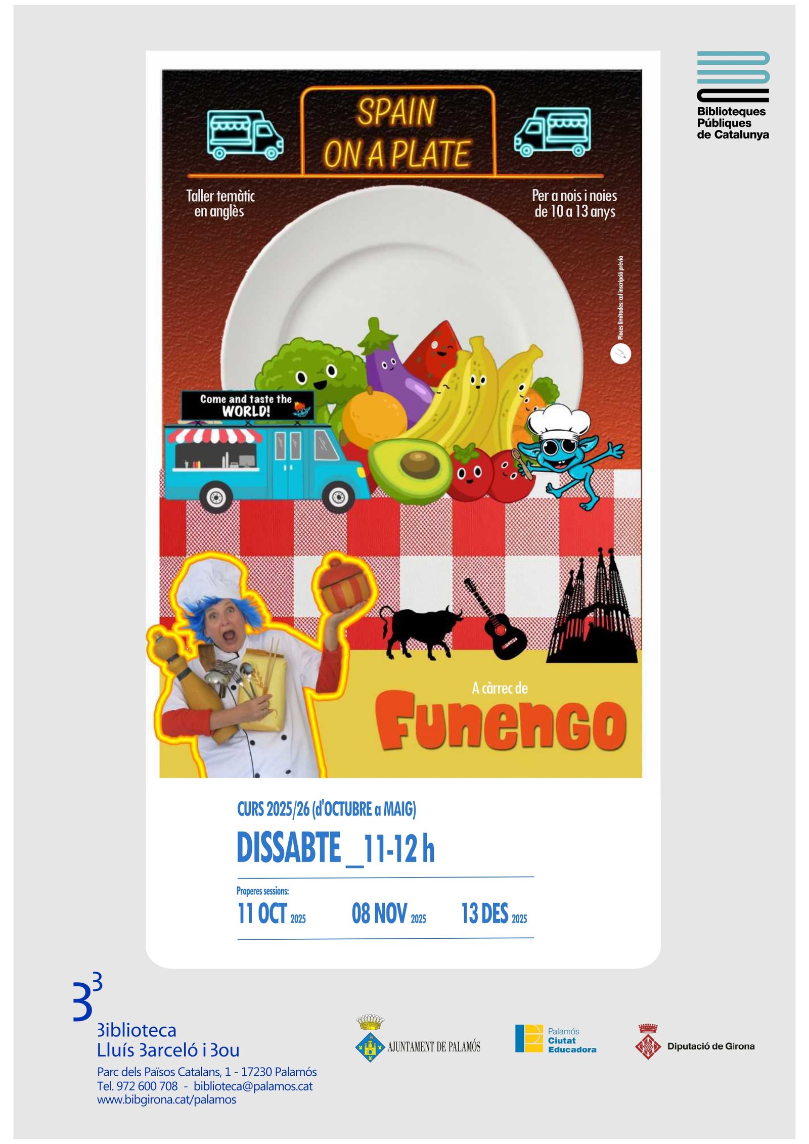 Biblioteca Lluís Barceló i Bou Parc dels Països Catalans, 1, Palamós, EspanyaCultura i PatrimoniSpain on a Plate és un taller temàtic en anglès a càrrec de Funengo.Uneix-te a nosaltres en un deliciós viatge per Espanya en aquesta aventura de cuina i llengua! Cada mes descobrirem una regió diferent preparant un dels seus plats més emblemàtics. Especialment dissenyat per a nois i noies, cada taller combina la cuina pràctica amb activitats lúdiques i gamificades que reforcen […]
