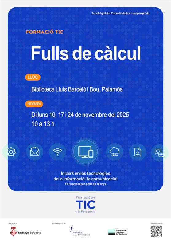 Biblioteca Lluís Barceló i Bou Parc dels Països Catalans, 1, Palamós, EspanyaCultura i PatrimoniUn full de càlcul és un programa informàtic que permet manipular dades numèriques i alfanumèriques disposades en forma de taules. És possible realitzar càlculs complexos amb fórmules i funcions i, a partir d'aquestes, dibuixar tot tipus de gràfics. Els més coneguts són: Microsoft Excel, Google Sheets i LibreOffice Calc.El taller consta de 3 sessions de 3 hores, els […]