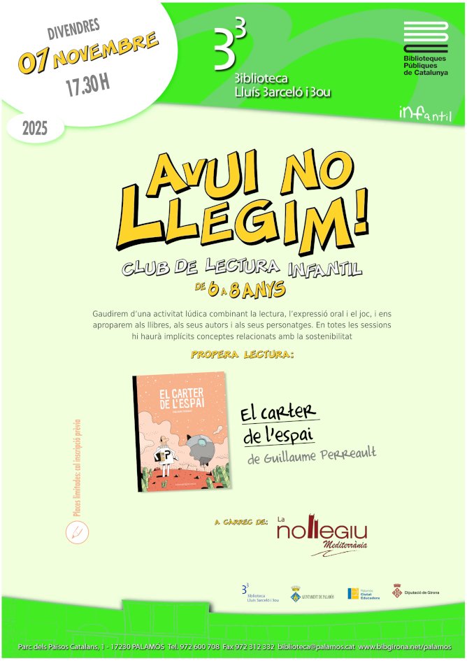 Biblioteca Lluís Barceló i Bou Parc dels Països Catalans, 1, Palamós, EspanyaCultura i PatrimoniAl club de lectura infantil parlarem del llibre El carter de l'espai, de Guillaume Perreault (Editorial Joventut), amb la Llibreria Nollegiu Mediterrània.A en Bob li encanta la seva feina i la seva petita rutina, fàcil i sense embolics: per a ell, el correu és sagrat!A bord de la seva nau espacial, reparteix cartes i paquets a […]