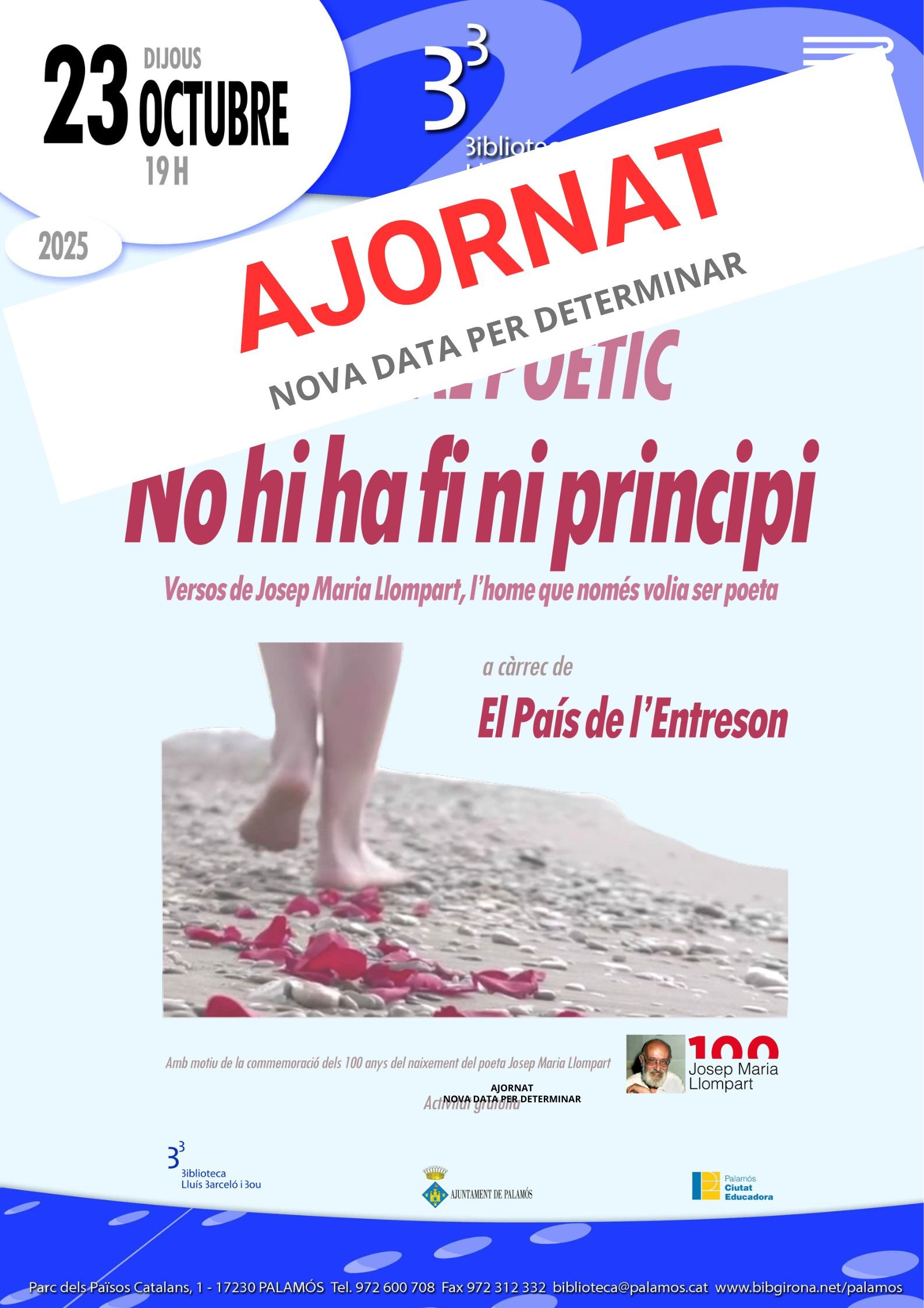 Biblioteca Lluís Barceló i Bou Parc dels Països Catalans, 1, Palamós, EspanyaCultura i PatrimoniNo hi ha fi ni principi, a càrrec d’El País de l’Entreson, amb motiu de la commemoració dels 100 anys del naixement del poeta Josep Maria Llompart.La posada en escena d’El País de l’Entreson us farà sentir de prop els versos de Josep Maria Llompart, l’home que només volia ser poeta. Poesia realista, amb tocs […]
