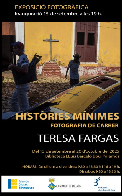 Biblioteca Lluís Barceló i Bou Parc dels Països Catalans, 1, Palamós, EspanyaCultura i PatrimoniAmb la intenció de registrar la vida quotidiana en llocs públics, la fotògrafa Teresa Fargas presenta l’exposició Històries mínimes: fotografia de carrer, un mosaic d'escenes urbanes on la ciutat es mostra a través de la seva gent.L'exposició es podrà visitar del 15 de setembre al 20 d'octubre de 2025, en horari de biblioteca (migdies tancat).