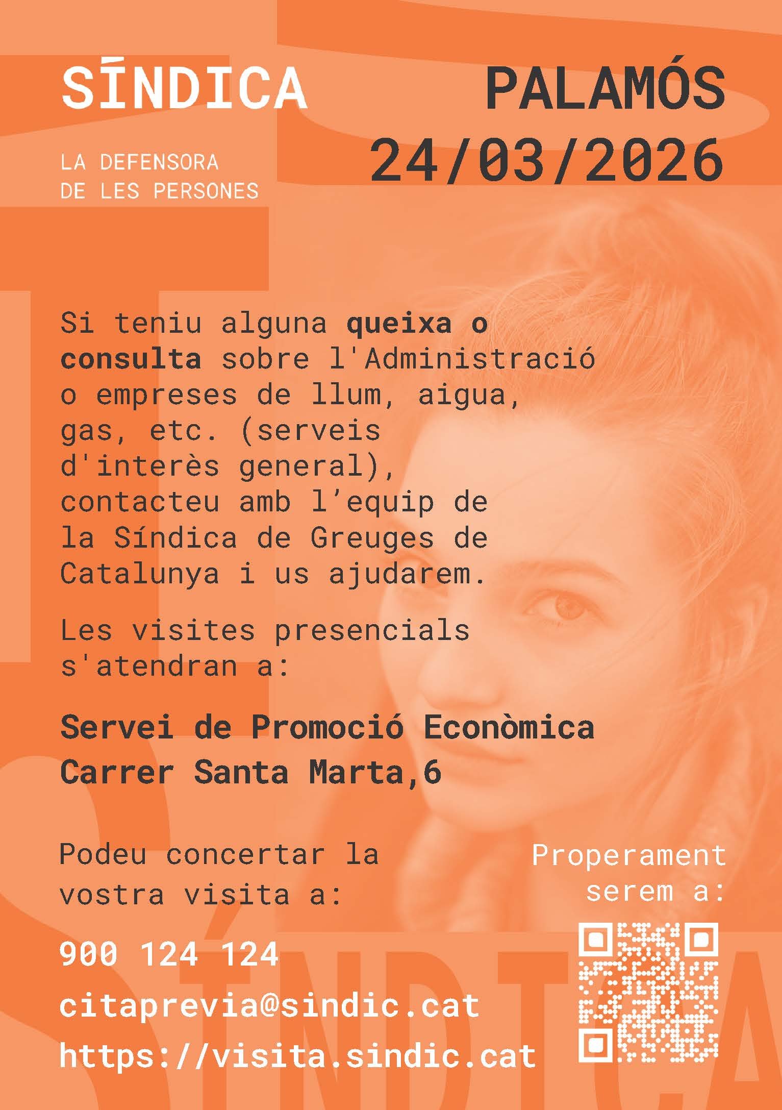 c. Santa Marta núm.6 c. Santa Marta 6, PalamósParticipació CiutadanaL'Oficina de la Síndica de Greuges de Catalunya es desplaça a Palamós per atendre queixes i resoldre dubtes als ciutadans i ciutadanes i a les entitats de Palamós. Es pot reservar cita prèvia: https://www.sindic.cat/ca/page.asp?id=552