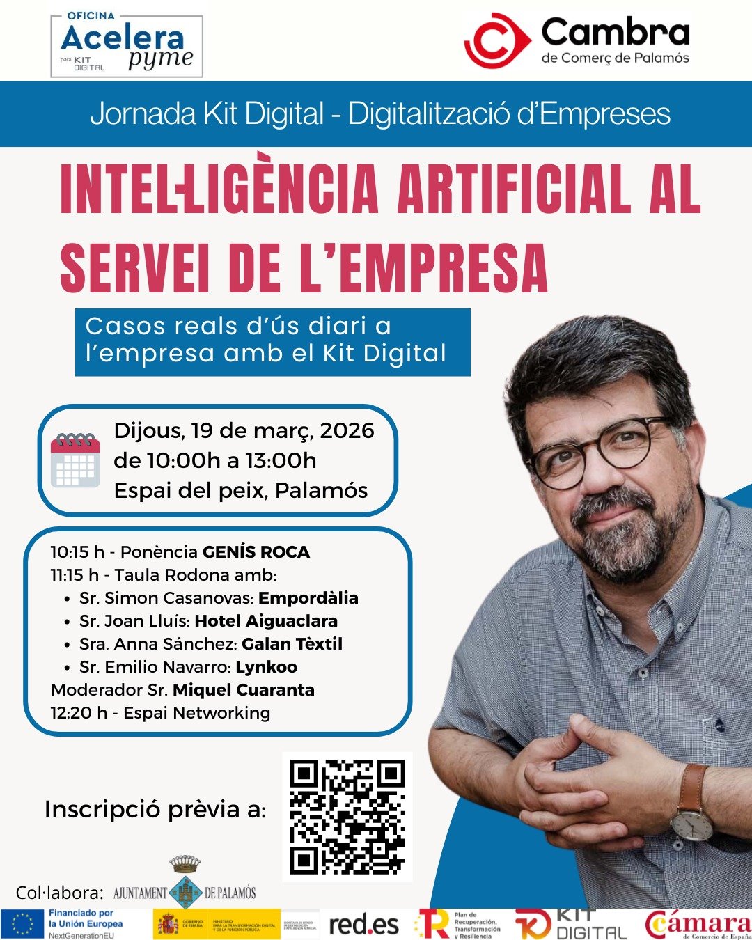 La Cambra de Comerç de Palamós organitza, amb la col·laboració de l’Àrea de Promoció Econòmica de l’Ajuntament de Palamós, la jornada “Kit Digital – intel·ligència artificial al servei de l’empresa: casos reals d’ús diari a l’empresa”, una sessió adreçada a empreses i professionals interessats a conèixer com la intel·ligència artificial pot contribuir a millorar la competitivitat i l’eficiència empresarial.
