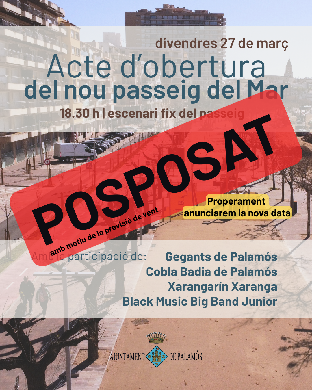 L’Ajuntament de Palamós ha comunicat aquest matí que els actes d’obertura del passeig del Mar previstos per divendres dia 27, han quedat posposats a nova data amb motiu de la previsió de vent que hi ha per tot el cap de setmana, fet que no permetria poder realitzar amb comoditat el programa previst. Aquesta anul·lació inclou tots els actes programats demà amb motiu de l’obertura del passeig, així com l’espectacle infantil de dissabte a les 18 h.