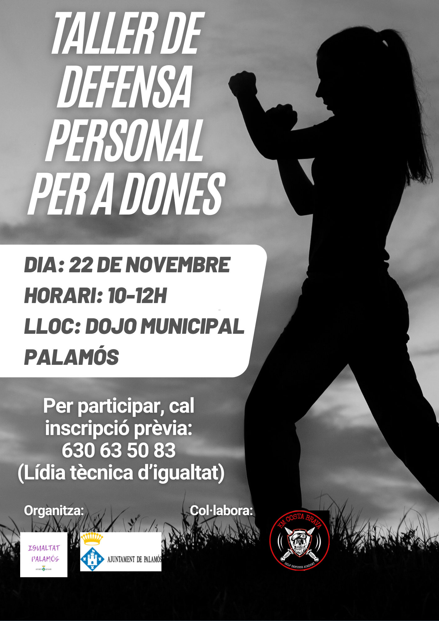 Dins les activitats que Palamós organitza al voltant del 25N, cal destacar el taller de defensa personal i autoprotecció adreçat a dones, totalment gratuït, que es durà a terme el proper dissabte 22 de novembre a la sala Dojo, ubicada a la zona esportiva Josep Massot i Sais, i per a la qual cal fer inscripció prèvia al telèfon de l’Àrea municipal d’Igualtat: 630 635 083.