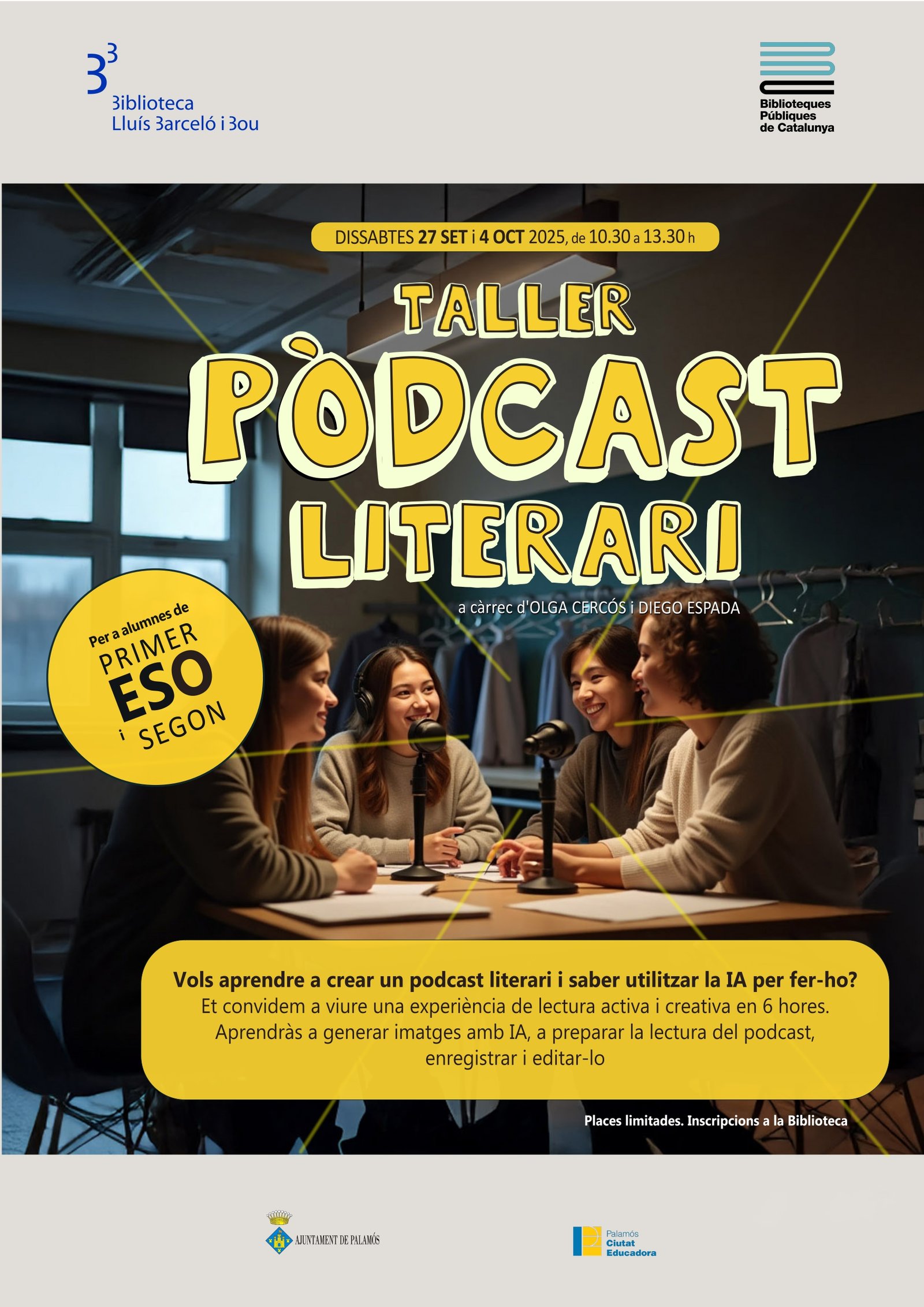 Biblioteca Lluís Barceló i Bou Parc dels Països Catalans, 1, Palamós, EspanyaCultura i PatrimoniTaller Pòdcast literari a càrrec d’Olga Cercós i Diego Espada.Vols aprendre a crear un pòdcast literari i saber utilitzar la IA per fer-ho? Et convidem a viure una experiència de lectura activa i creativa en 6 hores. Aprendràs a generar imatges amb IA, a preparar la lectura del pòdcast, enregistrar-lo i editar-lo.Adreçat a alumnes de primer i segon […]