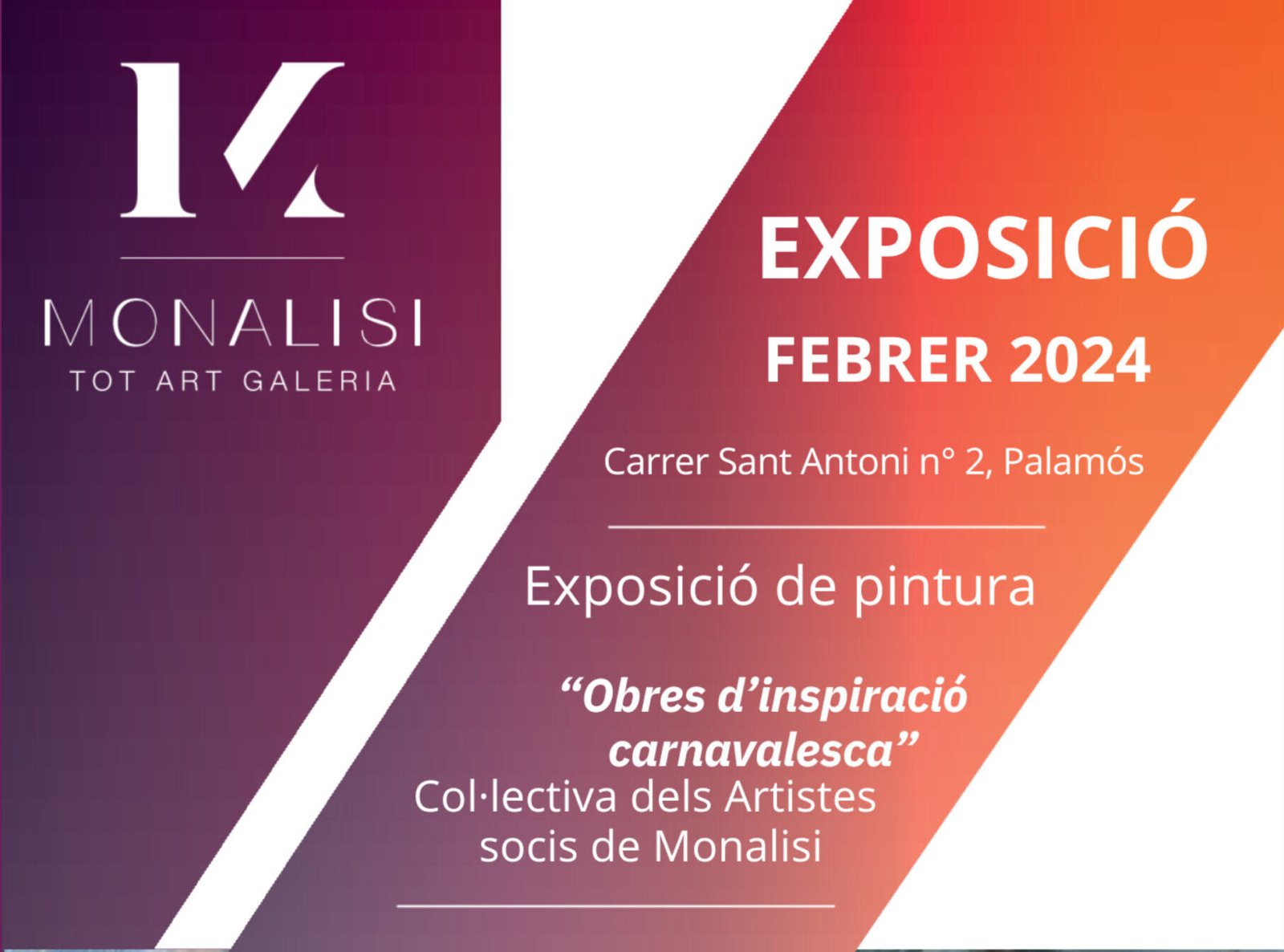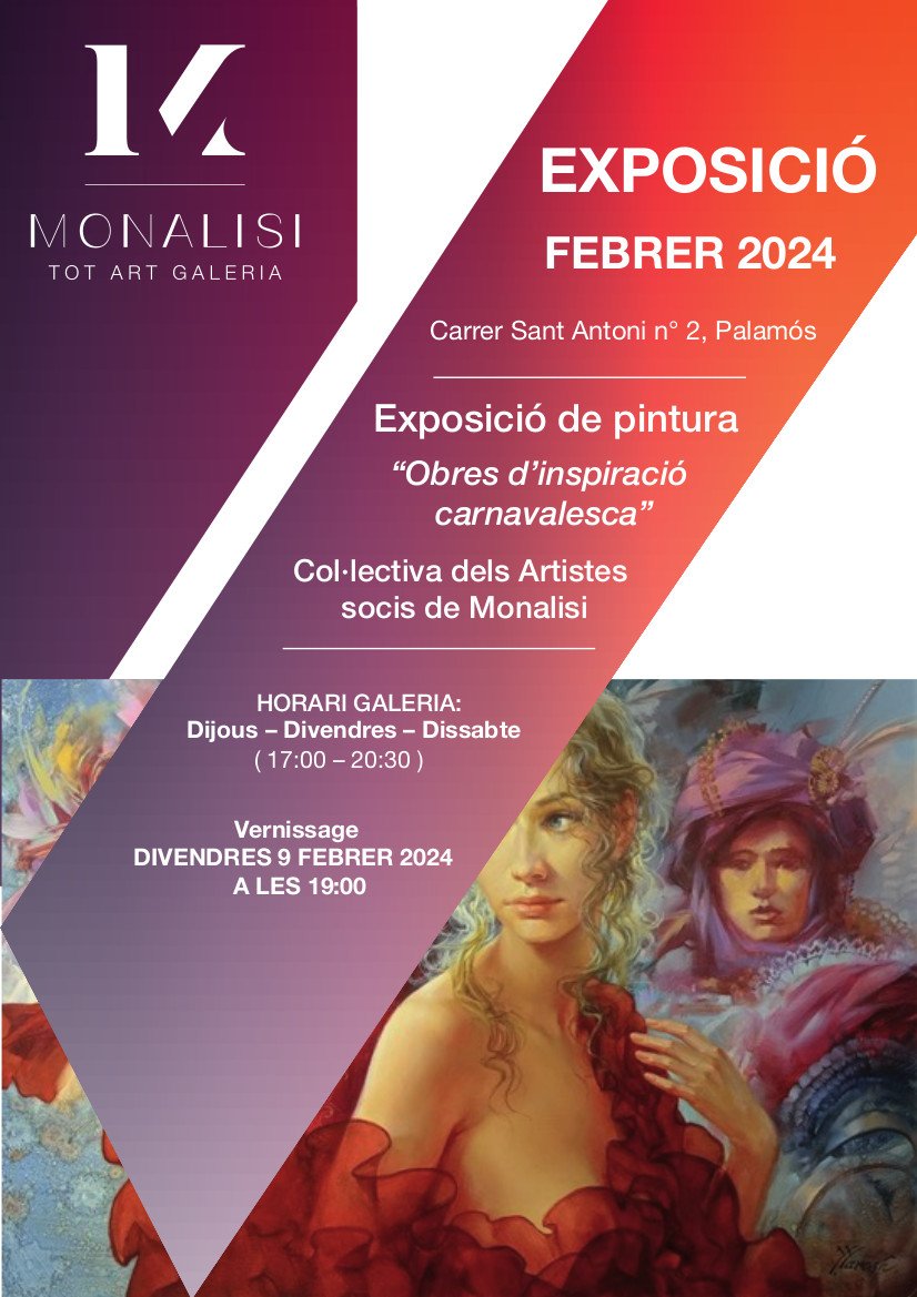 Monalisi Tot Art Galeria c/ Sant Antoni, 2, Palamós, EspanyaCultura i PatrimoniVernissage de l'exposició de pintura i Carnaval amb màscares i acordió “Col·lectiva dels Artistes Socis de Monalisi”